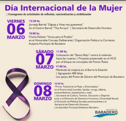 En el marco de la conmemoración del Día Internacional de la Mujer, el Municipio de Baradero a través del intendente Esteban Sanzio invita a la comunidad de Baradero a asistir y participar de diversas actividades organizadas por el estado, otras desarrolladas en conjunto con organizaciones sociales y políticas, así...