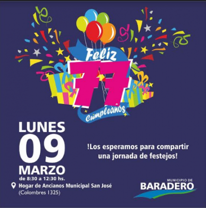 El lunes 9 de marzo a partir de las 8.30 horas, se realizarán los festejos del 77° aniversario del Hogar de Ancianos “San José” en sus instalaciones ubicadas en Colombres 1325.